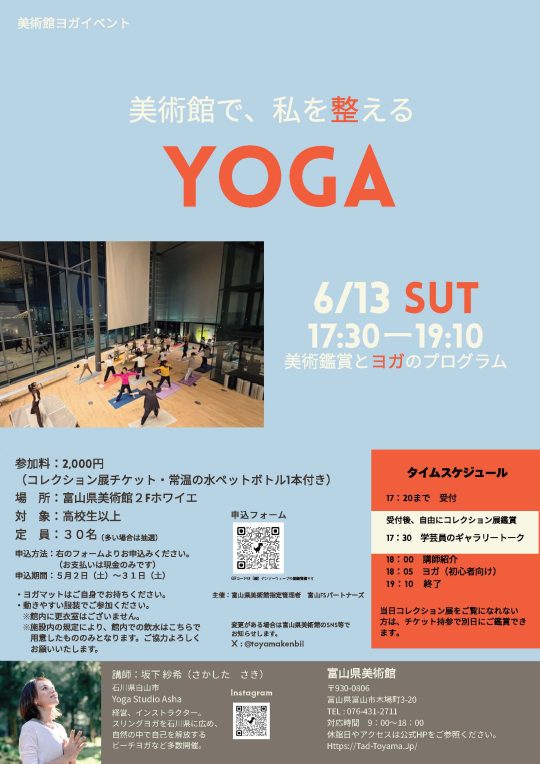 | 内容 | 【当日のタイムスケジュール】 ~17:20まで受付(受付後、自由にコレクション展を鑑賞いただけます) 17:30 学芸員ギャラリートーク 18:00 講師紹介 18:05 ヨガ開始(初心者向けリラックスヨガ) 19:10 終了 ※当日コレクション展をご覧になれない方は、別日にご鑑賞いただけます。(チケットをご持参ください) |